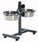 Hondenstandaard inclusief 2 RVS voer/waterbakken. De standaard heeft de vorm van een H en is uitgevoerd in een metaal met hamerslageffect in poedercoating. De standaard is in hoogte verstelbaar om er voor te zorgen dat de hond de juiste lichaamshouding heeft tijdens het drinken/eten, dit ondersteunt de spijsvertering. Doorsnede van de RVS bakken zijn 15 cm. De onderzijde is voorzien van rubberen voetjes om uw vloer te beschermen.