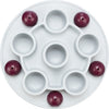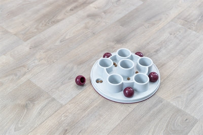Trixie Cat Activity Pentagon Wit/Bordeaux 28 cm De Trixie Cat Activity Pentagon Wit/Bordeaux 28 cm is een speelbord voor de kat dat de kat uitdaagt zijn voer of snacks uit de kuiltjes te vissen. Perfect om verveling tegen de te gaan en de kat mentaal te stimuleren! Dit speelbord bestaat uit vijf kuiltjes en vijf afdekkogels, waaruit en waaronder vandaan de kat met zijn poot zijn beloning moet zien te vissen. Dit daagt de kat uit actief bezig te zijn met zijn voer, zorgt voor mentale stimulatie en gaat verveling tegen. Dit speelbord wordt geleverd met een handleiding voor training en is voorzien van een rubberen onderkant die zorgt dat het bord niet verschuift tijdens het spelen.